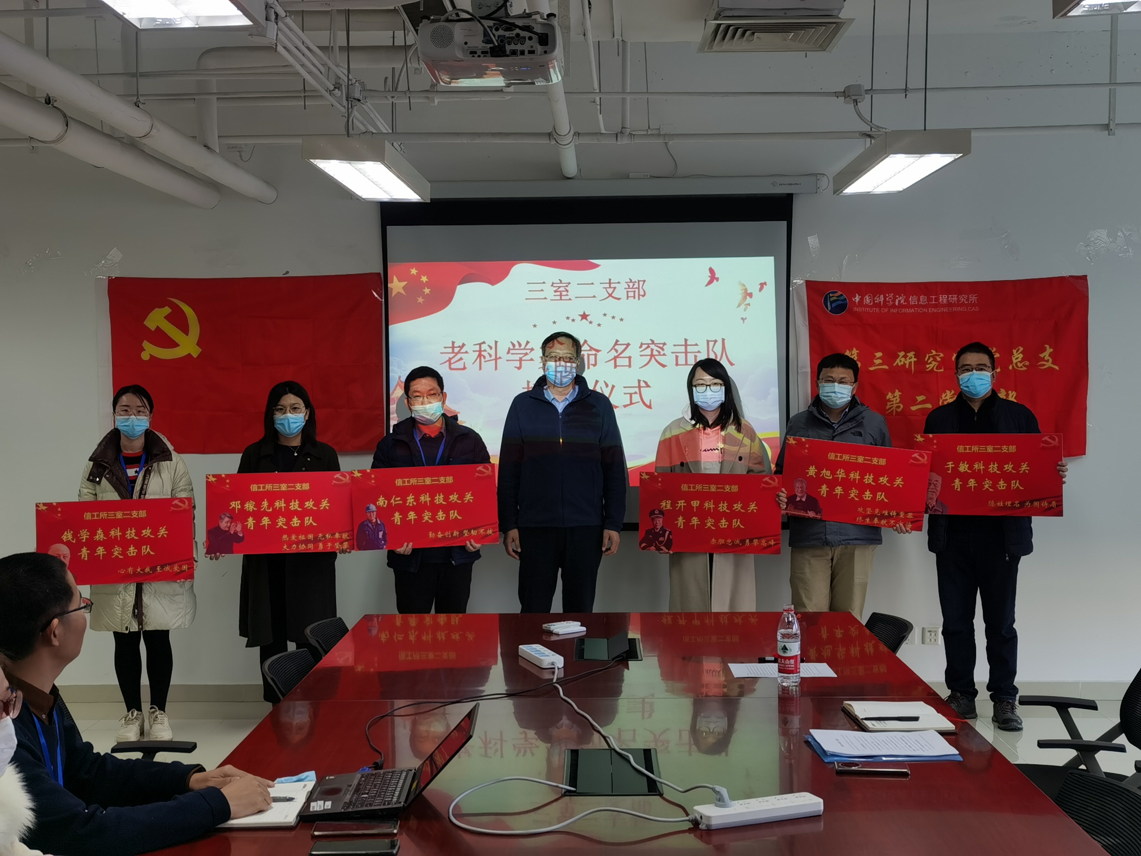 建党百年之际,为进一步强化全体党员向老科学家学习的意识,2021年11月9日,三室二支部举行了“以老科学家命名突击队暨授牌仪式”,共有46位党员同志参加了活动。