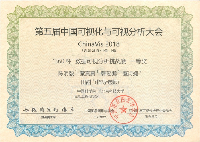 2018年7月28日,信工所第六研究室网络空间安全态势感知团队在2018年中国可视化与可视分析大会挑战赛(简称ChinaVis)中荣获一等奖。