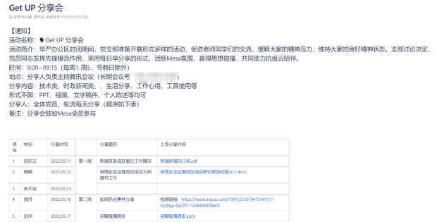 自5月11日起,每日“GET UP”分享活动均有支部的党员和积极分子围绕党建学习、技术交流、工作心得、防疫信息以及时政新闻等信息进行分享。此次活动旨在加强团队成员在居家办公期间沟通和交流,充分发挥基层党组织的战斗堡垒作用,不断增强党组织凝聚力和战斗力,切实把党员先锋模范作用体现在各项任务中。