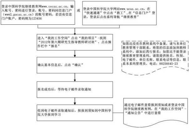 参加本期指导教师研讨班的导师均采取自行网上报名方式,即在2012年10月26日-11月9日期间,登录中国科学院继续教育网页(www.cecas.ac.cn)进行报名,获审核通过后,方可参加研讨班。导师报名流程说明详见附件。如报名后因故不能参加研讨班,请即刻登录中国科学院继续教育网页进行退报,以免影响整体报名工作。