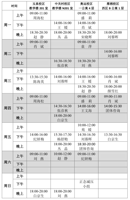 心理咨询具体安排见附件(团体咨询安排另行通知)