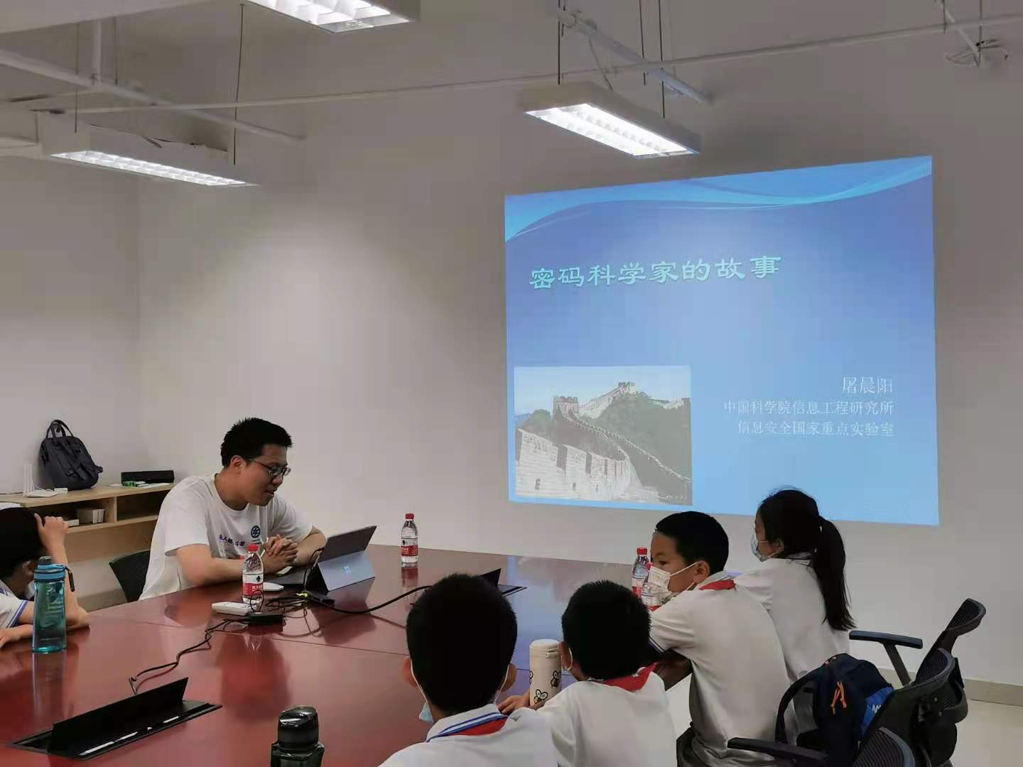 此次活动主要包括科普漫画展、互动游戏和科学报告会三项内容。科普漫画展中,实验室学生通过自主创作的十余副精美漫画,展示了实验室的历史、研究方向和研究领域内的基本科学原理,学生志愿者现场为参观师生介绍了漫画创作的初心和漫画阐述的科学知识,用艺术的形式让小学生受到科学启发;互动游戏环节,实验室老师组织参观的小朋友们完成了《Internationale Morse Code》小游戏,让小朋友们在游戏的同时感受到了密码的魅力;随后,屠晨阳博士做了《密码科学家的故事》主题科学报告,并与小朋友们进行了热烈的互动。