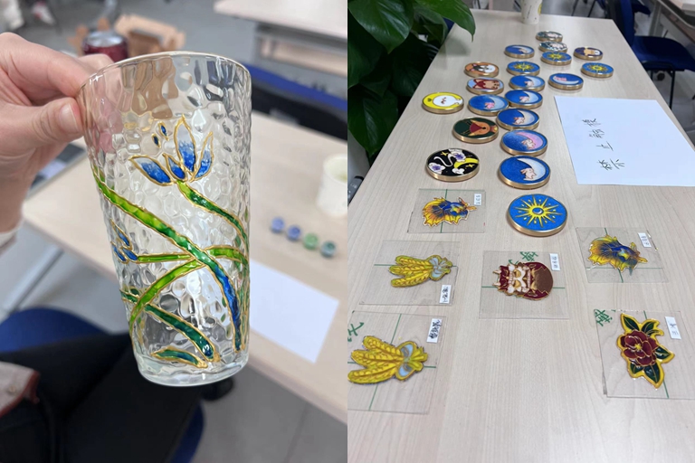 左图为彩绘水杯成品,右图为“掐丝珐琅”烤制前半成品
