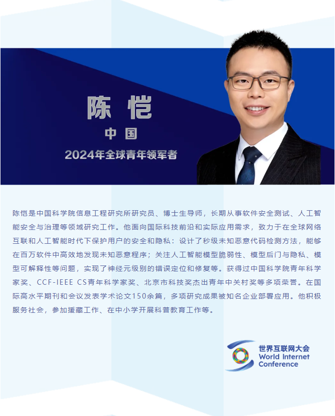 近日,世界互联网大会公布了本年度全球青年领军者名单,前沿创新与科教融合中心主任陈恺研究员入选,以表彰其在软件安全测试、人工智能安全与治理等研究领域的贡献。