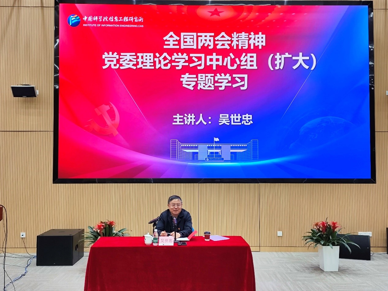 3月27日下午,中国科学院信息工程研究所召开理论学习中心组(扩大)集体学习会,传达学习习近平总书记在全国两会期间发表的重要讲话和全国两会精神。第十四届全国政协委员、中国工程院院士吴世忠作专题报告,研究所党委委员、纪委委员、技术副总师、科技部门及职能部门中层领导干部、党总支及直属支部书记、党支部书记等近70人参加会议。会议由党委副书记、所长郭莉主持。