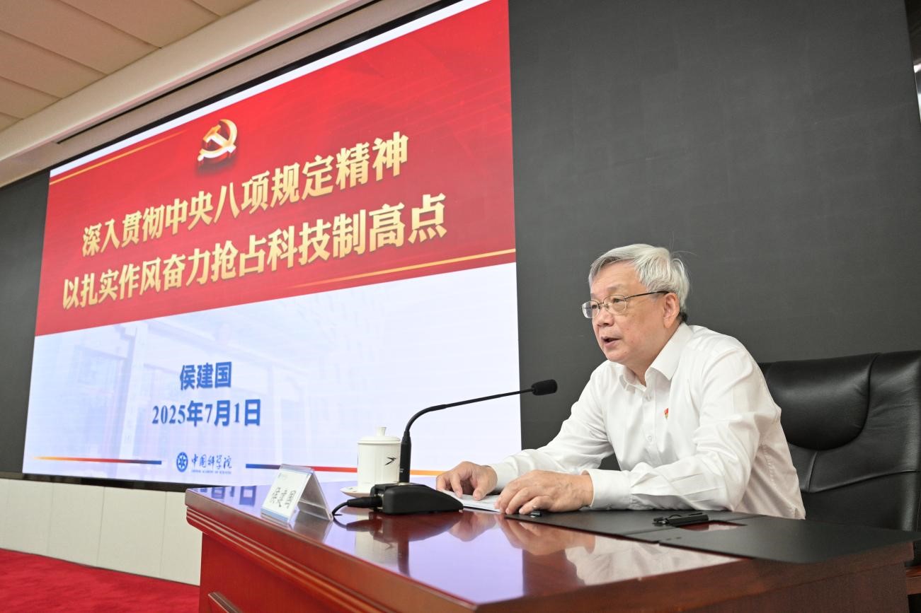 侯建国对锲而不舍落实中央八项规定精神提出四点要求。一是要锤炼党性修养、深化学习教育,确保学有质量、查有力度、改有成效。二是要多措并举整治形式主义、官僚主义为基层减负,积极培育厉行节约反对浪费的节俭之风。三是要坚持严的基调不动摇,持续推动正风肃纪反腐相贯通。四是要加强创新文化建设,大力弘扬廉洁自律的新风正气,为抢占科技制高点提供强大精神动力。他强调,全院上下要更加紧密地团结在以习近平同志为核心的党中央周围,坚定拥护“两个确立”、坚决做到“两个维护”,锻造过硬作风学风,奋力抢占科技制高点,为全面实现“四个率先”和“两加快一努力”目标,早日建成科技强国和实现中华民族伟大复兴再立新功。