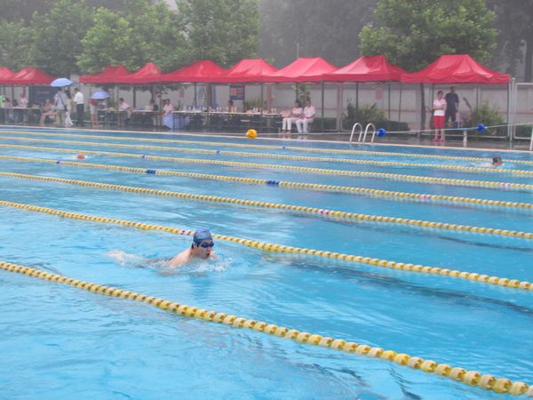 雨急似箭,落在地面激起无数的水泡,参赛队员不顾风雨,奋勇争先。朱海涛、陈驰再传佳绩,分别在男子甲组50米蛙泳和男子乙组100米蛙泳中获得铜牌。王钰含作为参赛女将,巾帼不让须眉,勇夺女子甲组100米蛙泳银牌和50米蛙泳铜牌。