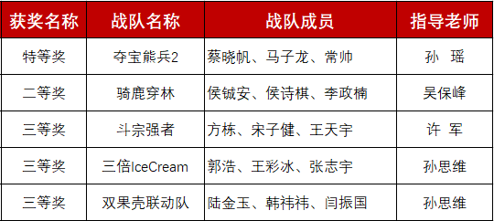 信安国重夺宝熊兵2战队、骑鹿穿林战队、斗宗强者战队、三倍IceCream战队、双果壳联动战队在比赛中获奖。其中,由信安国重学生蔡晓帆、马子龙、常帅组成的夺宝熊兵2战队获得特等奖,孙瑶研究员荣获优秀指导教师奖。